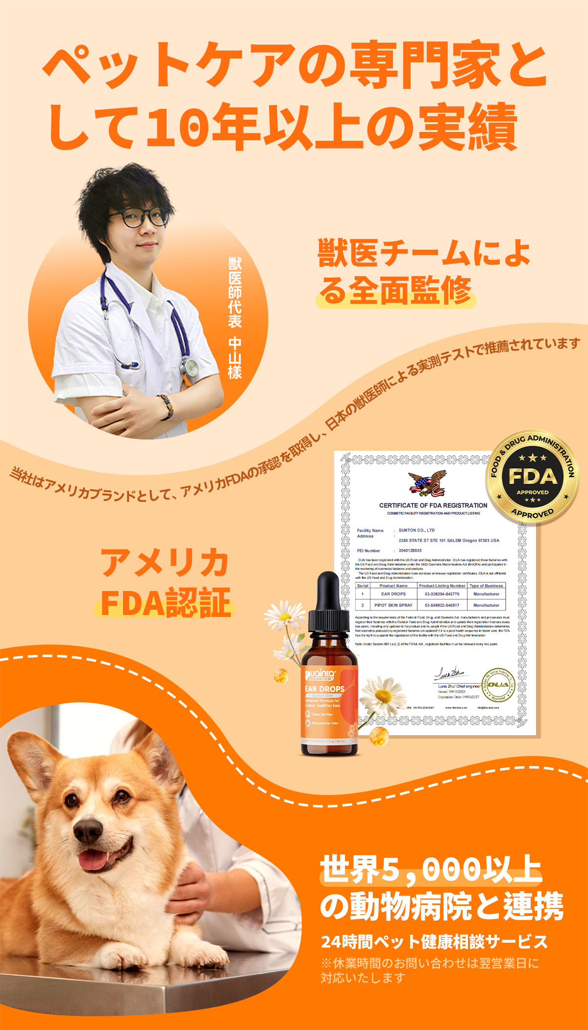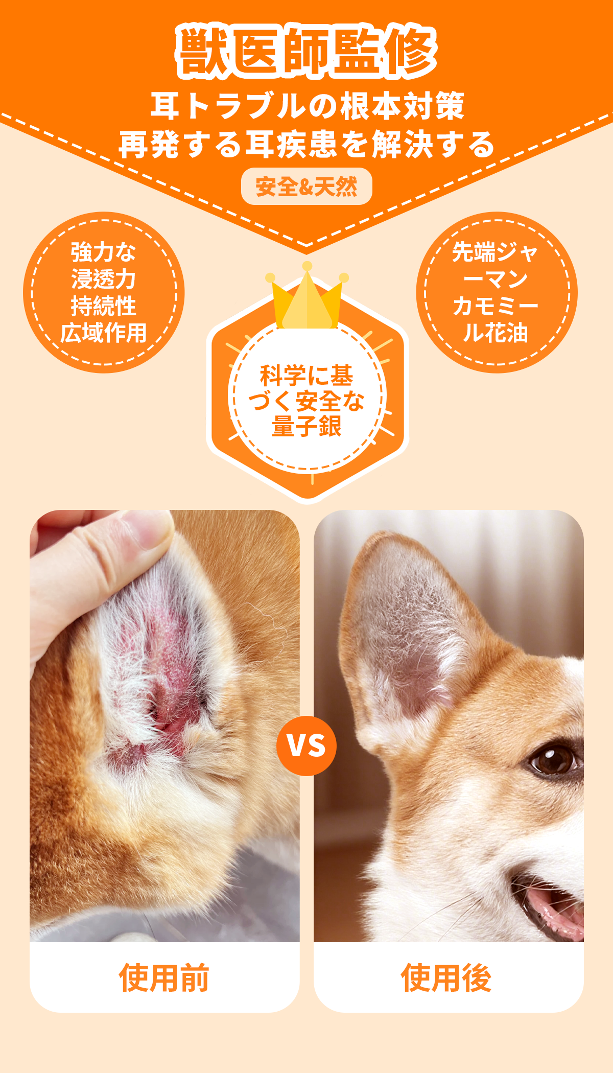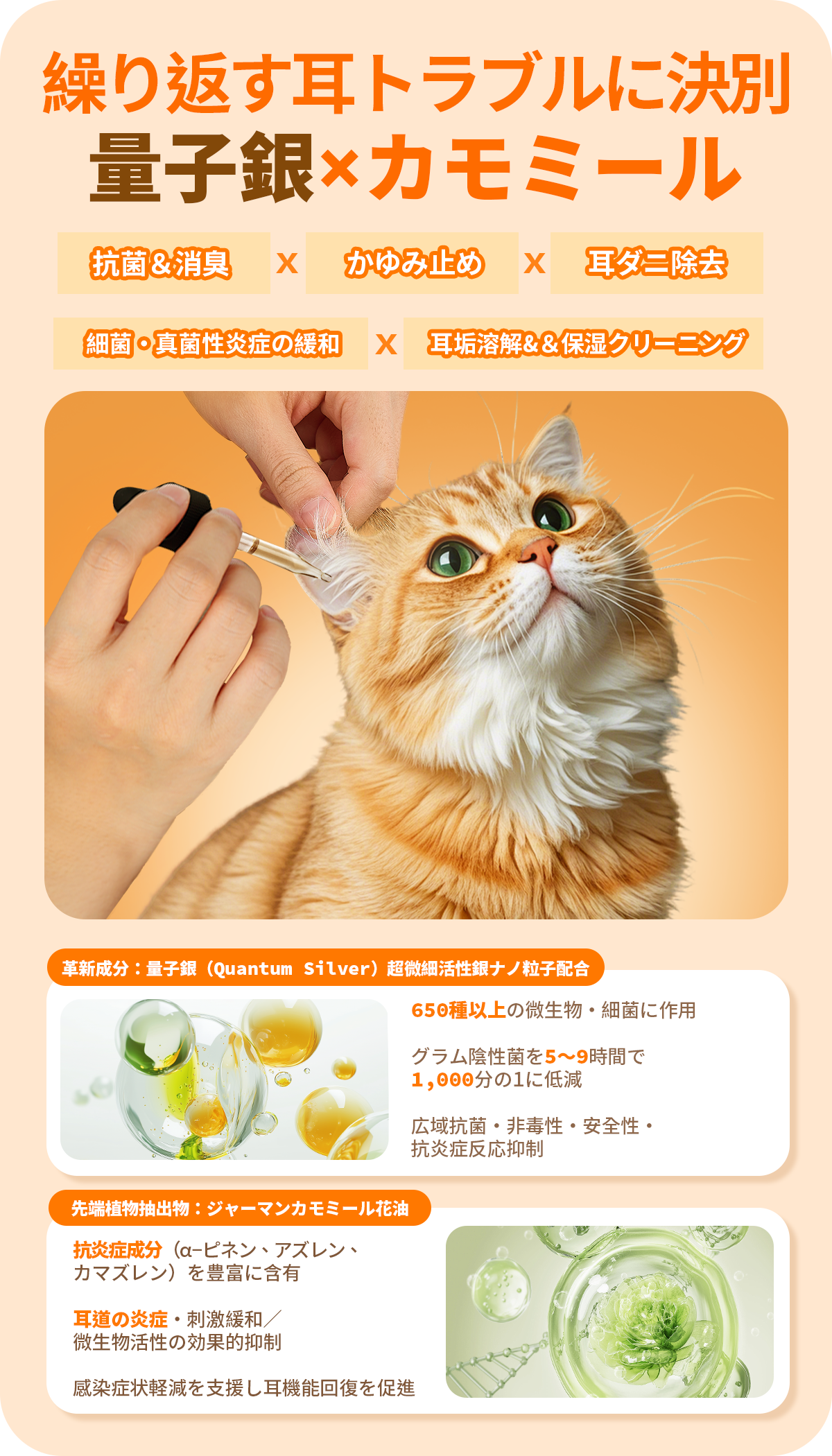 プロの獣医師との共同監修のもと、臨床実証済みの革新的な科学成分:量子銀+先端植物エキス(カモミール花油)を採用。