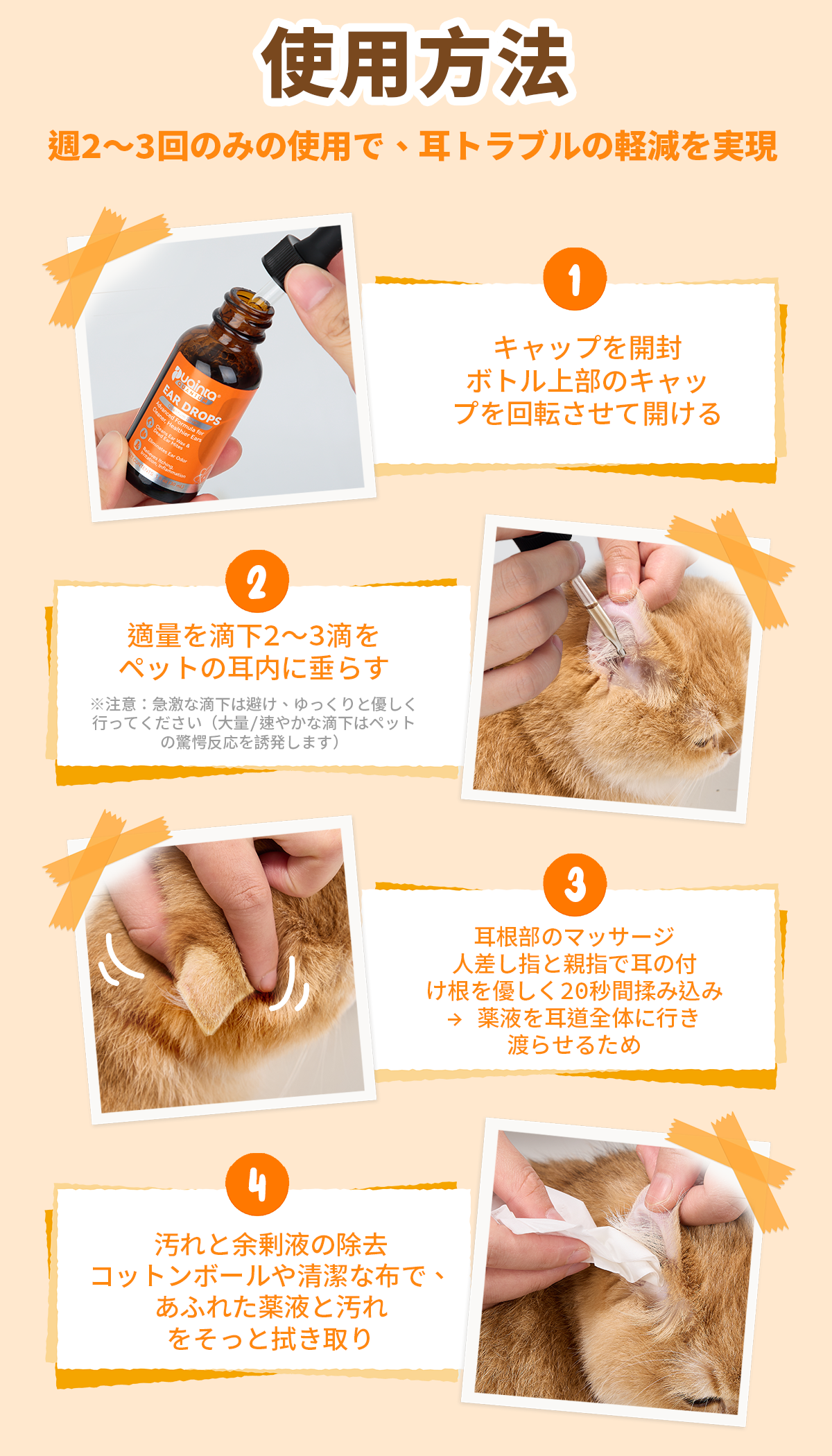 2.必要に応じて適量をペットの耳に塗布してください。